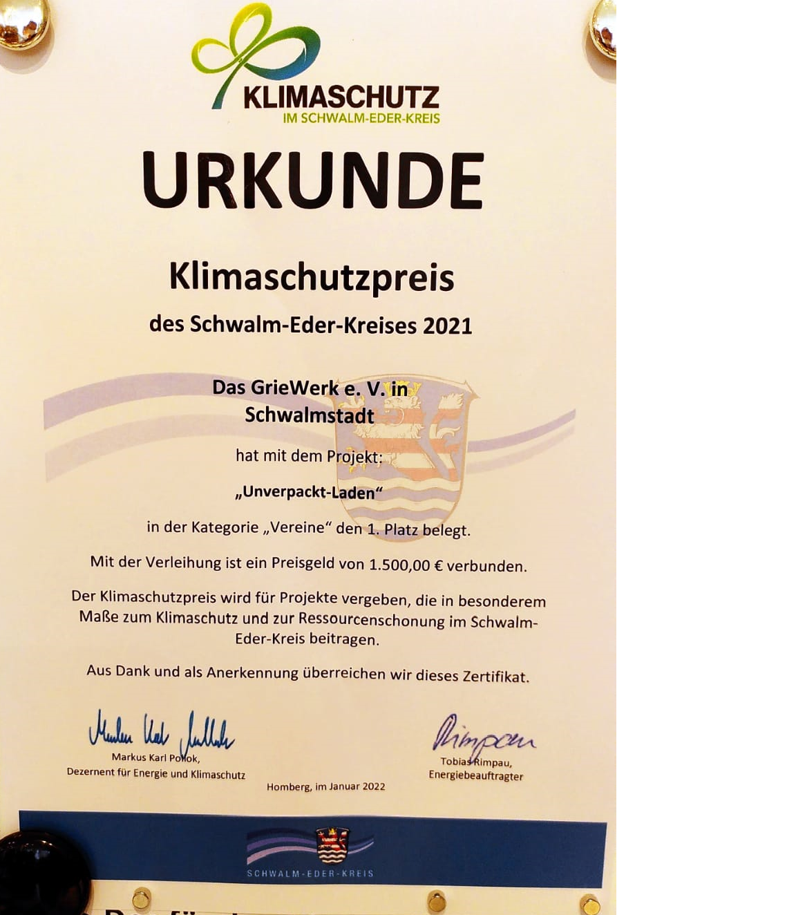 GrieWerk wurde vom Schwalm-Eder-Kreis mit dem Klimaschutzpreis 2021 ausgezeichnet.