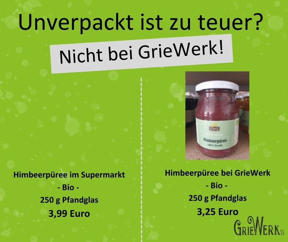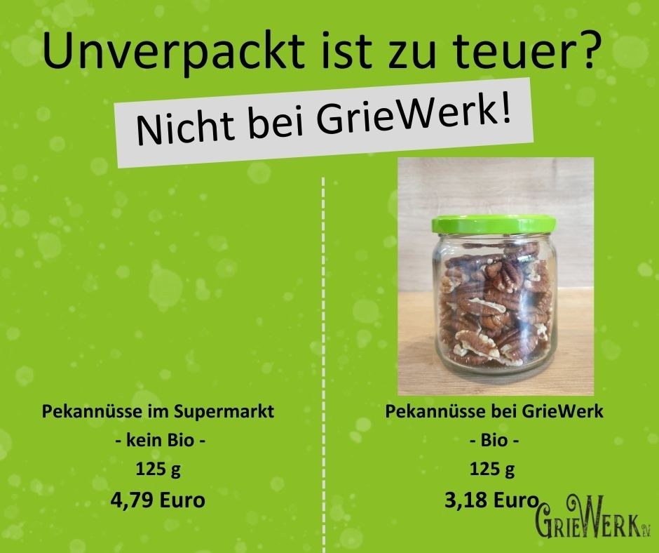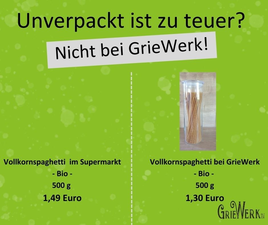 Viele denken, es sei zu teuer, im Unverpacktladen einzukaufen. Doch bei GrieWerk vermeiden wir hohe Kosten und deshalb können wir den Einkaufspreis mit einem geringen Zuschlag direkt an euch weitergeben. Viele Lebensmittel sind deshalb bei uns sogar günstiger als im Supermarkt - zumindest, wenn ihr Bio mit Bio vergleicht und nicht Äpfel mit Birnen.